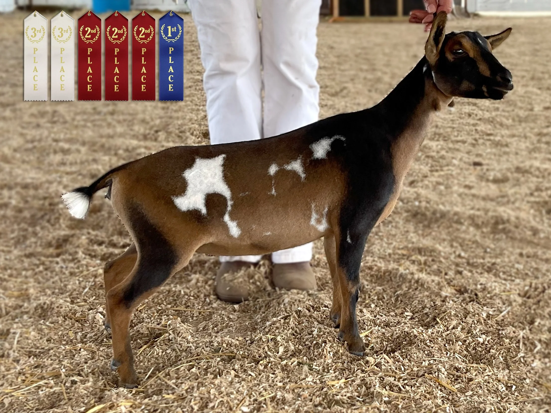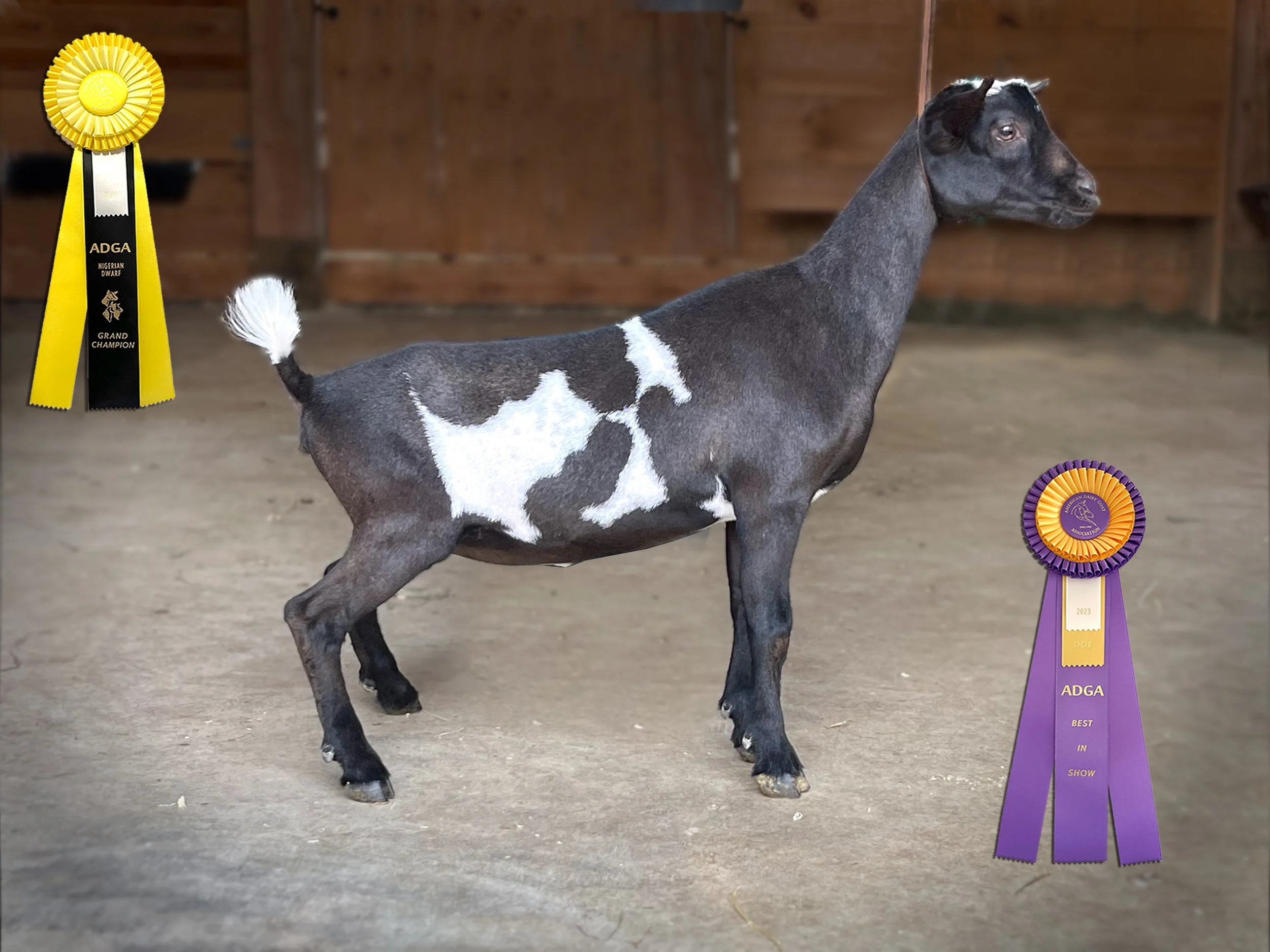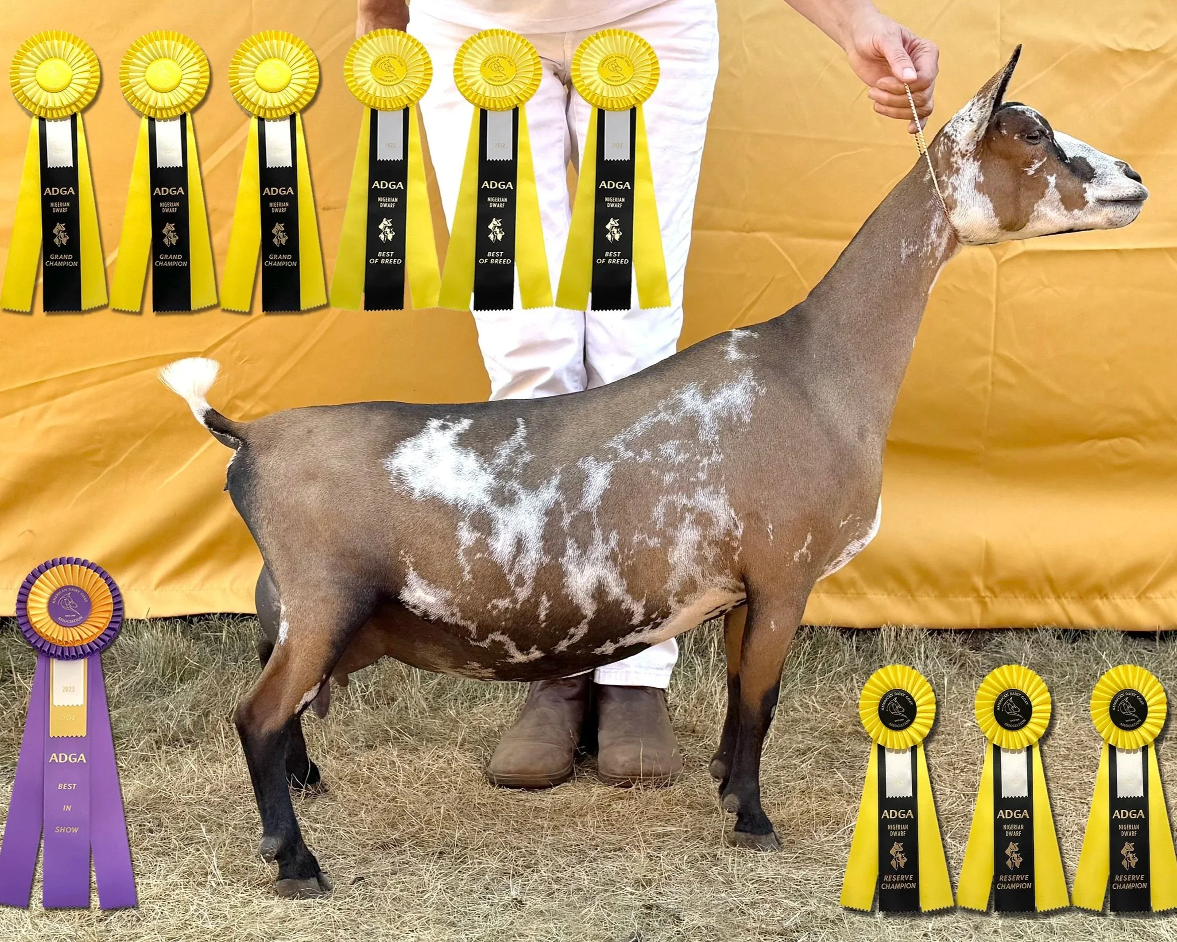 Permanent Champion (pending), 1x Best In Show, 3x Grand Champion, 5x Reserve, 8x Best of Breed, 1x Best Udder In Show; LA 2023 46 Fore Udder Attachment/ 40 Rear Udder Height/ 46 Rear Udder Arch. Milk test high 7.4 lbs