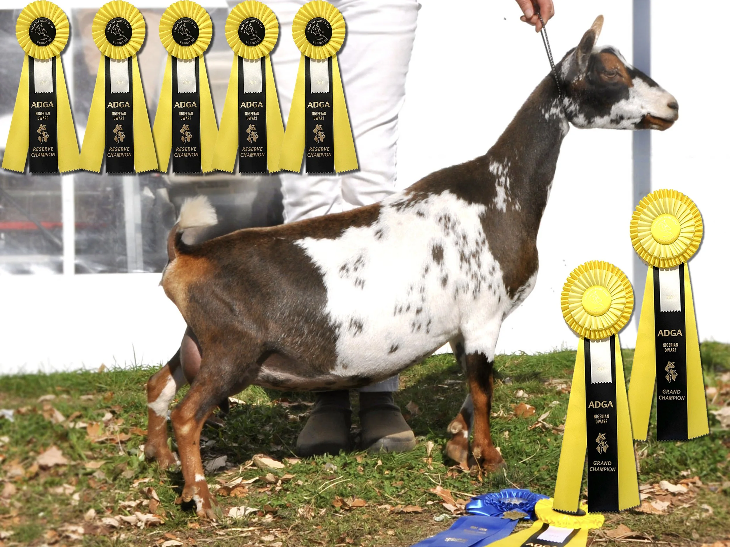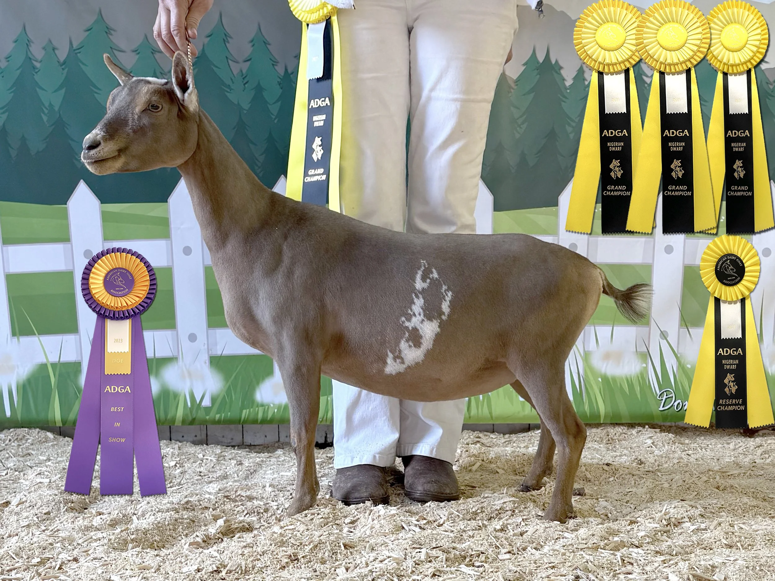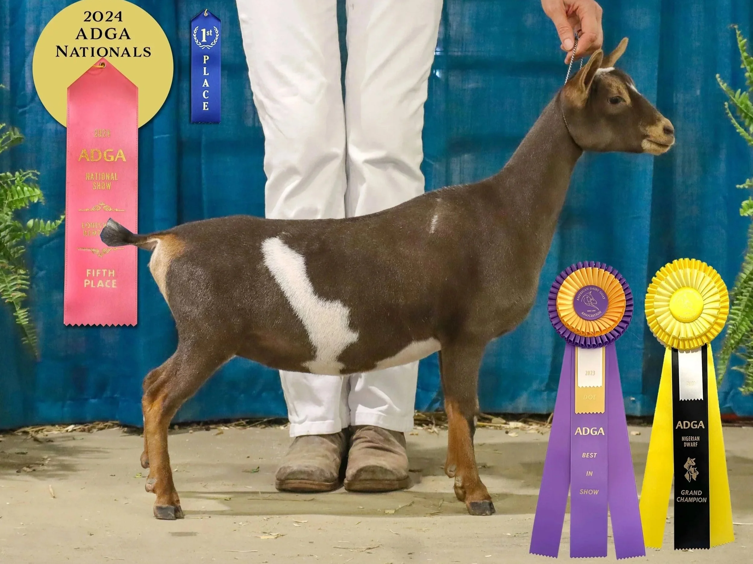 Permanent Champion (pending), 1x Best In Show, 3x Grand Champion, 5x Reserve, 8x Best of Breed, 1x Best Udder In Show; LA 2023 46 Fore Udder Attachment/ 40 Rear Udder Height/ 46 Rear Udder Arch. Milk test high 7.4 lbs