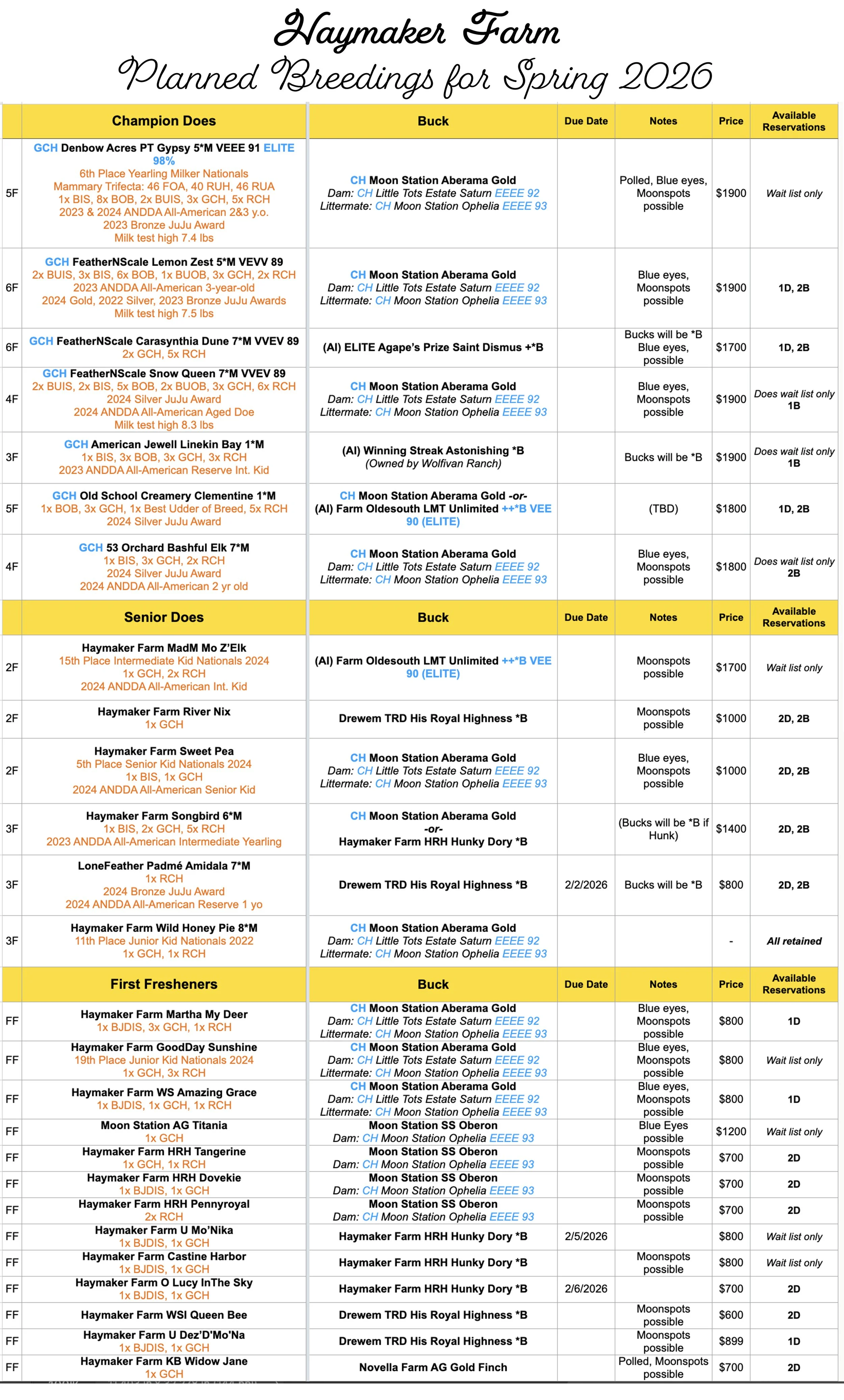 Doeling prices from first fresheners start at $600. Pricing shown is only guaranteed with pre-paid reservations and may increase after evaluation for unreserved kids. Haymaker Farm reserves the right to retain any kid, even if there is a reservation on it; in that case, deposits will be returned.
